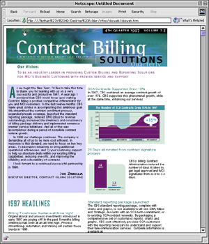 Every quarter we design a newsletter for Contract Billing Solutions. This is the online version of their newsletter. I do not design the printed newsletter, I just pull graphics from the printable file and create a web version. It is narrow because it appears inside a frame on the overall CBS departmental site, with their main navigation down the left hand side. |