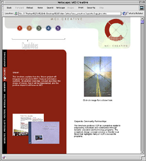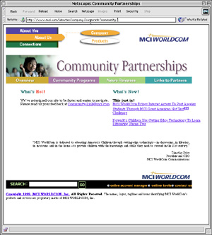 On the now defunct MCI Corporate Website, I designed the template for the Community Partnerships Section. They wanted the site to be fast loading and simple. My solution turned out to be just that. |