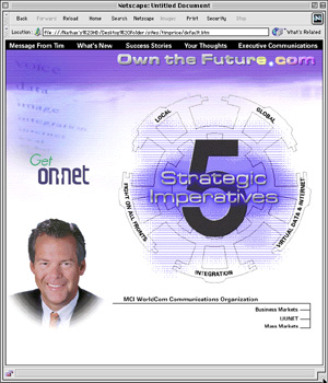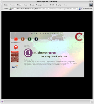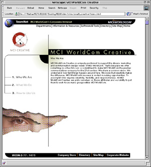 MCI Creative is a small design group within MCI WorldCom. We provide the corporation with design for all sorts of corporate communications. These include both printed and on-line media. This is our current departmental website, which features information about our department, an online portfolio section (which is being updated this week, so there are some holes), and a script to request the opening of a new job. This site is hosted on our local departmental web server. It's a Macintosh G3, running Webstar 3.0. It is graphically intensive, but loads quickly when viewed on a machine attached to our speedy intranet. The site marks our first official use of cascading style sheets, and dynamic html layers. As a department, we had stayed away from these technologies in the past to avoid problems with older browsers.