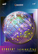 Concert Internet Plus Developed to announce the launch of the world's first global Internet backbone, this design highlights the combining of BT's and MCI's networks to form the regional "superhubs" that will create this seamless service. |